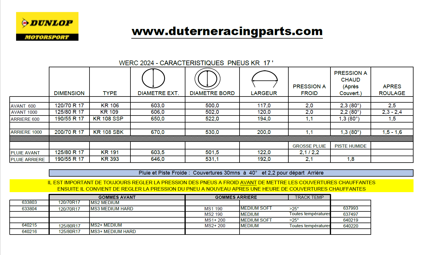 Plus d’info sur : https://www.dunlop.eu/fr_fr/motorcycle/safety-and-technology/tire-compound-information.html ou via notre rubrique contact : https://www.duterneracingparts.com/contact/